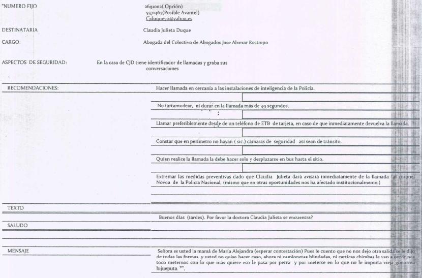 1.2.- Prueba documental donde se observa seguimientos y amenazas en contra de la señora periodista CLAUDIA JULIETA DUQUE ORREGO, recordemos la información que reposa en la Az No 1.4 que contiene documentos en los que constan las consultas a bases de datos con información de la citada profesional del periodismo |9|, labores de inteligencia técnica |10|, registro fotográfico de su residencia ubicada en el barrio Quinta Paredes |11| "Quinta del Ciprés Cra. 47 No 22ª6", organigrama en el que aparecen las fotografías de los integrantes del Colectivo de Abogados José Alvear Restrepo -CAJAR-, distribuidas según el cargo que cada uno desempeñaba en dicha entidad, observándose la fotografía de CLAUDIA JULIETA DUQUE como parte de la denominada área internacional |12|.