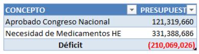 5. El Hospital tiene L. 9, 000,000 en el rubro de medicamentos para todo el resto del año, cantidad que es insuficiente, puesto que sólo en 16 medicamentos de los 121 tipos de medicamentos considerados indispensables dentro del cuadro básico del hospital y que incluyen oncológicos, trasplante renal, anestesia para cesáreas, sueros para pacientes, que significan L. 3, 115,750 (tres millones ciento quince mil setecientos cincuenta) para un mes de atención.